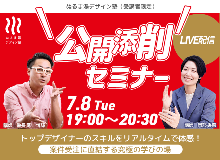 変化のあるタイトル文字と目を引く「赤」の背景色で講師の情熱とリアルタイムの臨場感を表現しているのがポイントで、オンタイムのわくわく感とそこで得られる学びの大きさが伝わるレターを加えました。