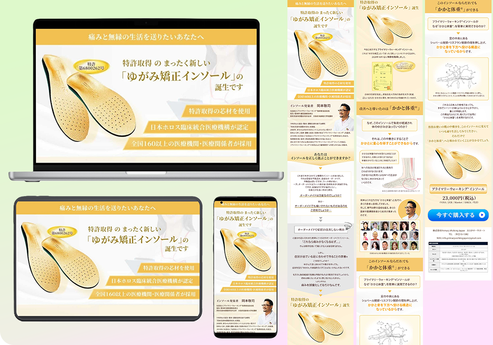 特許取得をし、医療機関にも採用されているインソールの権威性と信頼感が伝わるデザインとしました。